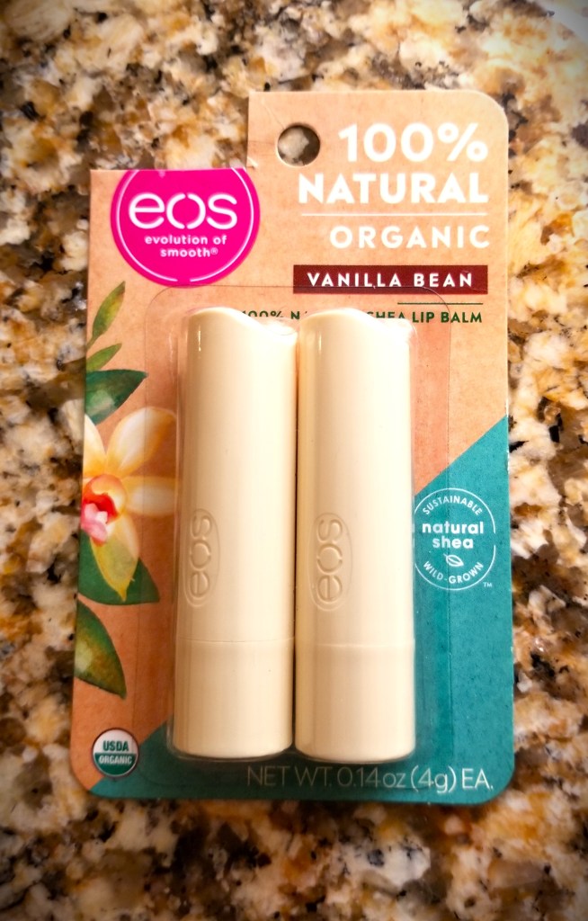 Eos’s Vanilla Bean and Sweet Mint 100% Organic Lip Balms contain organic, sustainable wild grown natural shea.